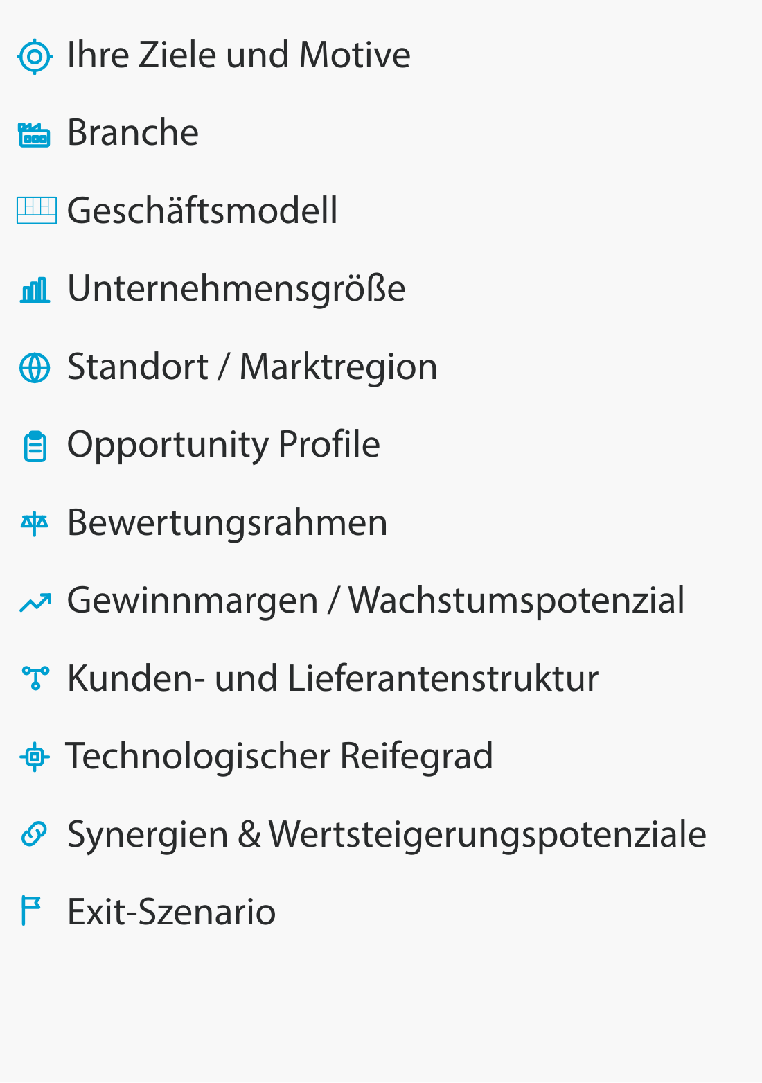 Entwickeln Sie Klarheit über Ihr Käuferprofil und Ihre Investment Thesis – systematisch statt Trial-and-Error.
